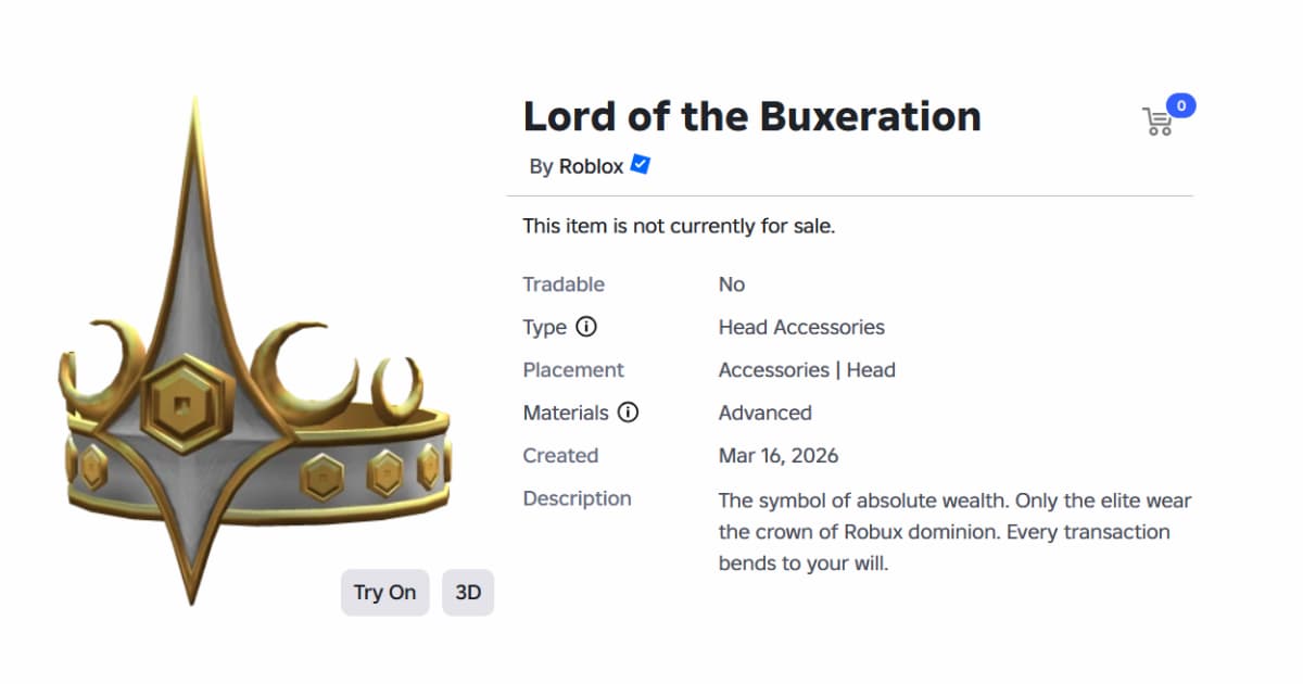Roblox has uploaded the Lord of Buxeration Head Accessory as part of their Federation Crown series. These are some of the most exclusive items on the platform, unlocked only after massive Robux purchases and available in limited quantities. If the idea of owning one is tempting, just know you are looking at a minimum of 50,000 Robux on the cheaper end. We will be sticking to our regular crowns and saving Robux, thanks!